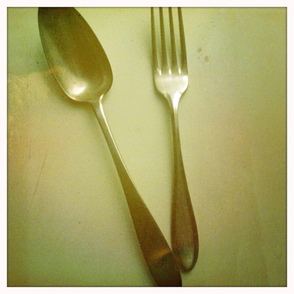 Ein paar silberne Gabeln und Löffeln, alle von ca. 1884, das Geburtsjahr meines Großvaters, den ich leider nie kennengelernt habe, der aber ein toller Mann gewesen sein muss! Ich liebe sie so sehr, denn sie sind total verbeult und erzählen tausende Geschichten.